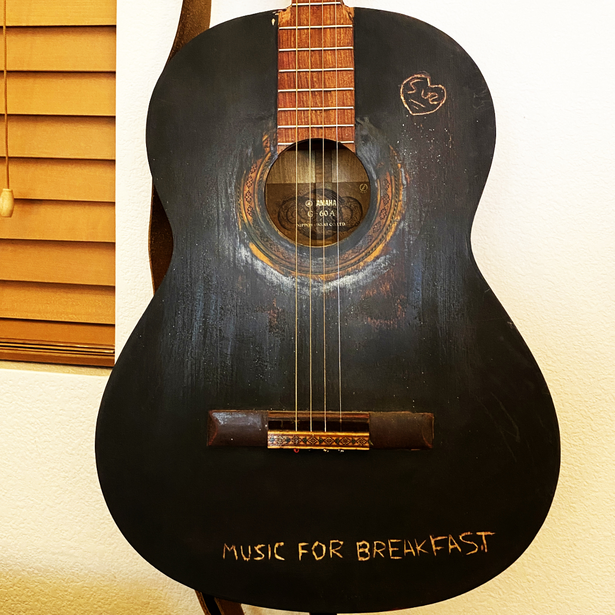 It was once a $79 Yamaha classical guitar. I did $5 worth of web music in trade for it. Fifteen years later I took a Dremel and cut the neck narrower and tuned it in fifths, like a tenor, only in E. The intonation is garbage and the tone is garbage and it's virtually unplayable. Also a thick coat of black paint to cover up where I washed and scraped off the thick layer of tempera paint isn't helping. I have real guitars. I keep hoping this one gets run over by a truck.