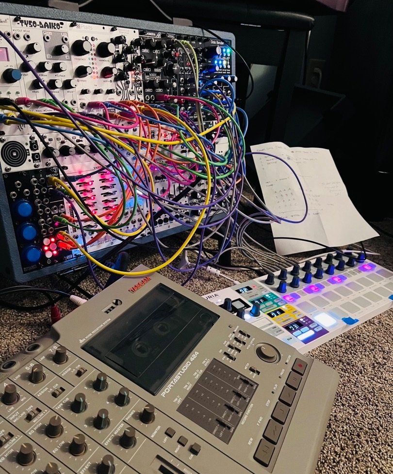Burr ended up taking Track 3 and did a fantastic job using approximately 2439 cables to connect the modular synth setup into something that worked. It's all voodoo to me! When I got home, I added a bass synth part to the song which now had clear sections with the addition of drums.