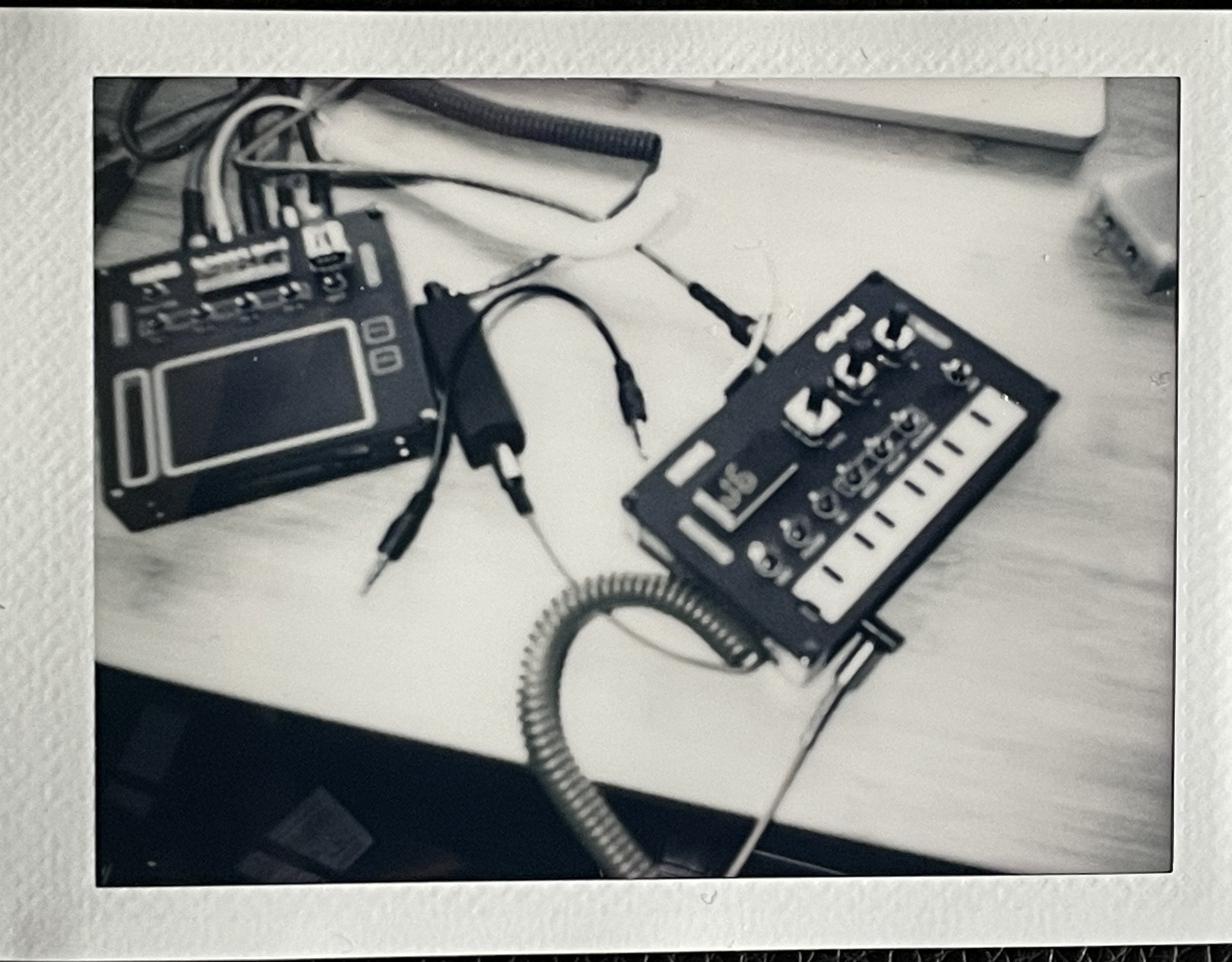 The synths have a headphone jack that is an input signal to set the tempo. The click (with some EQ and volume changes) is registered by the synth as the bpm so anything you program will, ahem, SHOULD play at the tempo of the click. Each of the people use the same click so their synths play at the same tempo. Since it is tape, however, the signal isn’t always completely reliable so there are usually glitches in the plan but that also makes it fun.