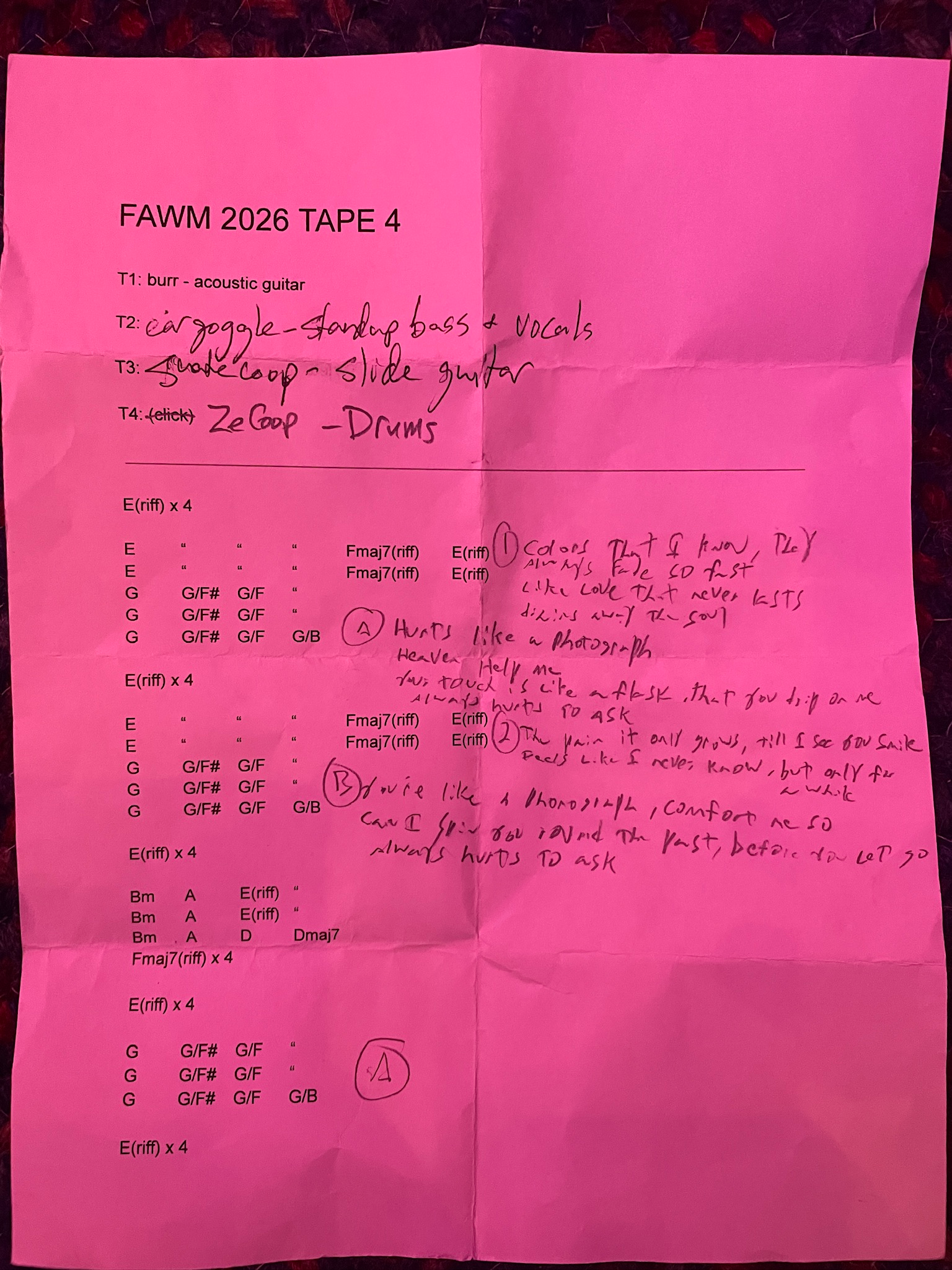 Burr: really pleased with how this one turned out! when you start a tape you never know what direction it will go, and you even forget what you did! i love the sonic textures and dynamics choices you all made. lyrics really fit the vibe, too.